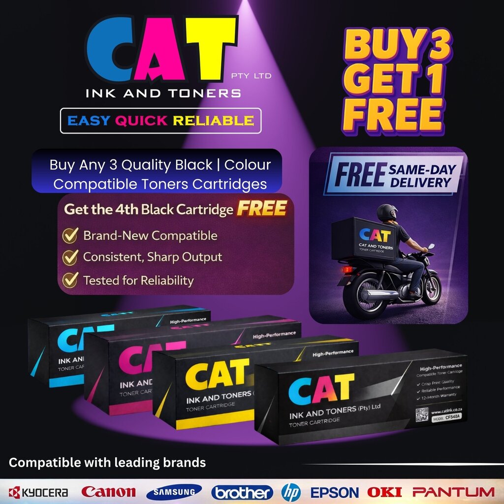 Cat Ink and Toners (Pty) Ltd supplies brand new, quality compatible printer cartridges and toners at competitive prices. We provide reliable products, great print quality, and free delivery, including same-day and next-day delivery in Gauteng and nationwide delivery across South Africa.