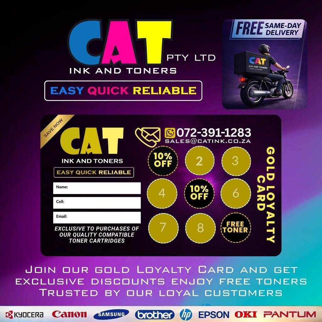 Cat Ink and Toners (Pty) Ltd supplies brand new, quality compatible printer cartridges and toners at competitive prices. We provide reliable products, great print quality, and free delivery, including same-day and next-day delivery in Gauteng and nationwide delivery across South Africa.